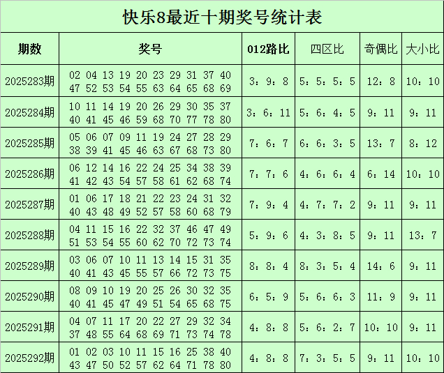 福彩快乐8第2025292期开奖回顾:01 02 03 10 11 15 16 25 38 40 43 47 50 52 57 62 64 71 78 80,其中奖号012路比为4:8:8,四区比为7:3:5:5,奇偶比为9:11,大小比为10:10。